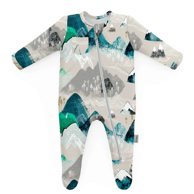 This print is the result of a collaboration with Nouveau Bohemian in Byron Bay, Australia. The Rocky Mountains Milk Snob® footed pajamas are slight...