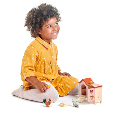 A sweet wooden chicken coop and family; a rooster, 2 hens, a little chick, freshly laid eggs, 2 nests, and a feeding trough. Toys for this generati...