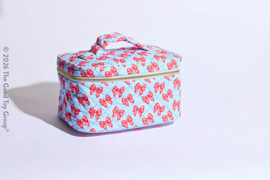 Discover stylish on-the-go organization and serve trendy vibes! This must-have quilted vanity bag features cute pink bows on a light blue backgroun...
